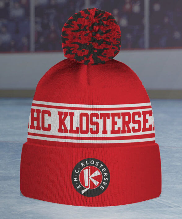Die Wintermütze für den EHC Klostersee Fan, Strickmütze mit dem aktuellen EHC Klostersee Logo und Bommel.